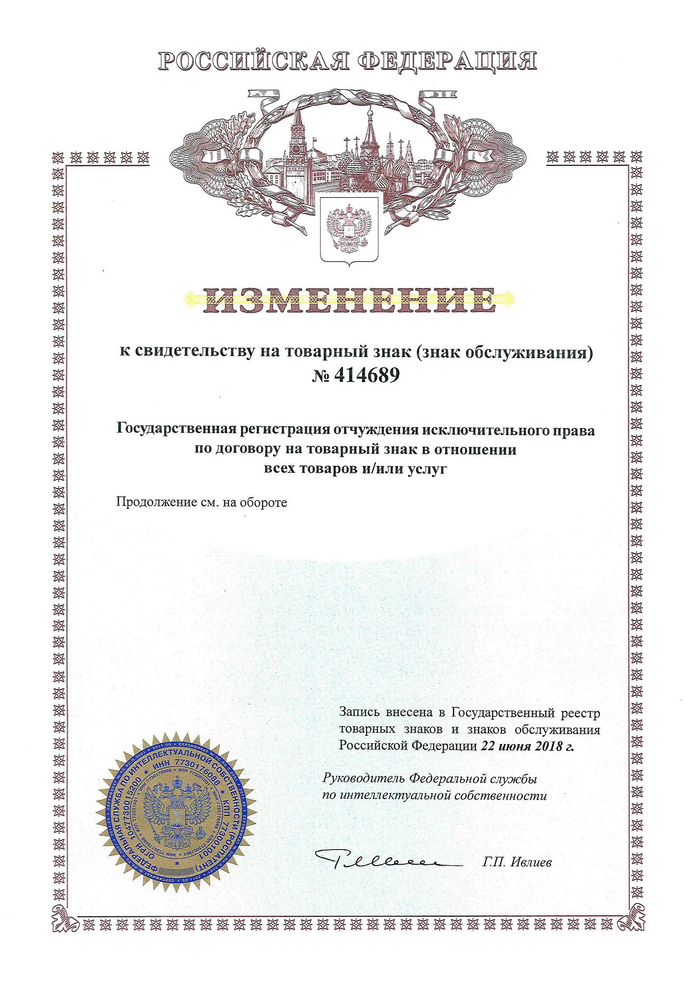 Изменение к Свидетельству на ТЗ отчуждение 22.06.2018